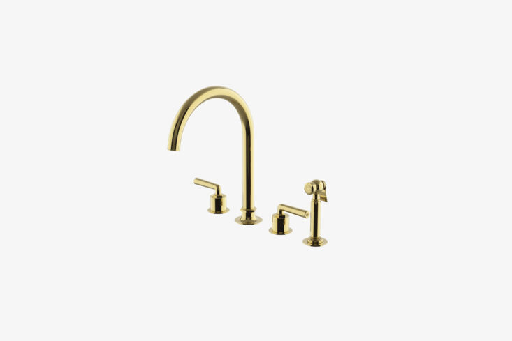 Above: The faucet is the Waterworks Henry Three-Hole Gooseneck Kitchen Faucet with lever handles and a sprayer, all in brass; $3,300 at Waterworks.