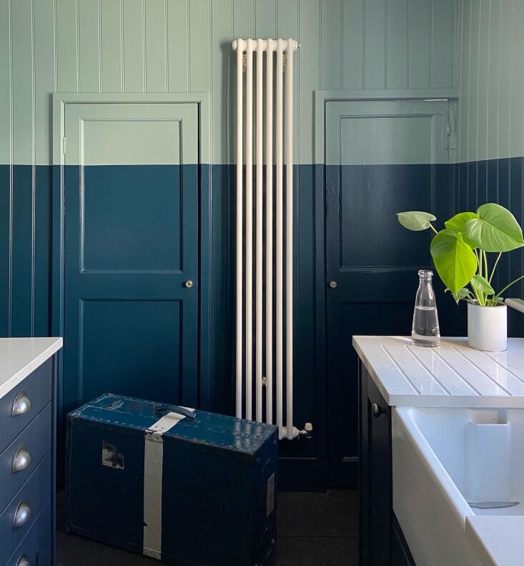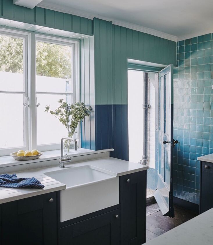 Above: Russell introduced beadboard paneling and used color blocks of blue to create perhaps the most memorable room in the house. The new cabinets are from Wickes and the counter is quartz: after the discovery of woodworm—and the surprise collapse of the floor overhead—all had to be salvaged, stored, and later reinstalled.