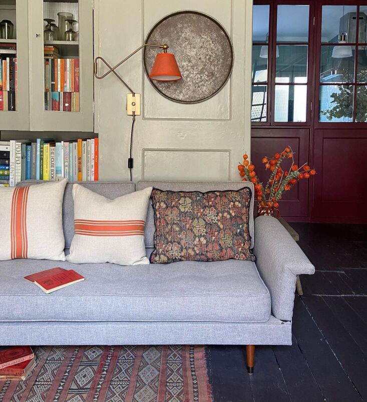 Above: The sofa is a reupholstered eBay purchase and the brass swing light is the Cooper Wall Fitting, £136, from Pooky. Using sconces rather than overhead lighting, Russell notes, “lends itself to the heritage of the building and keeps the rooms cozy and intimate.”