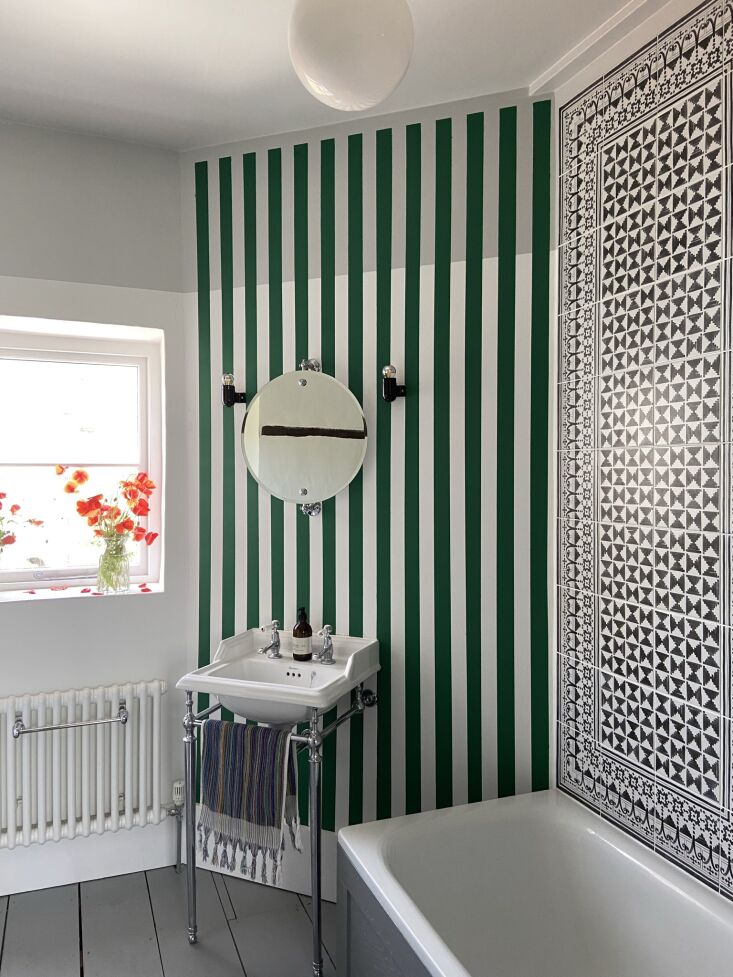 Above: Russell says he has “zero talent” when it comes to construction or “any kind of DIY,” but he knows how to paint. Needless to say, applying stripes in rooms with very irregular lines was challenging. Here, he used Farrow & Ball’s Verdigris Green. The black and white tiles are from Fired Earth.