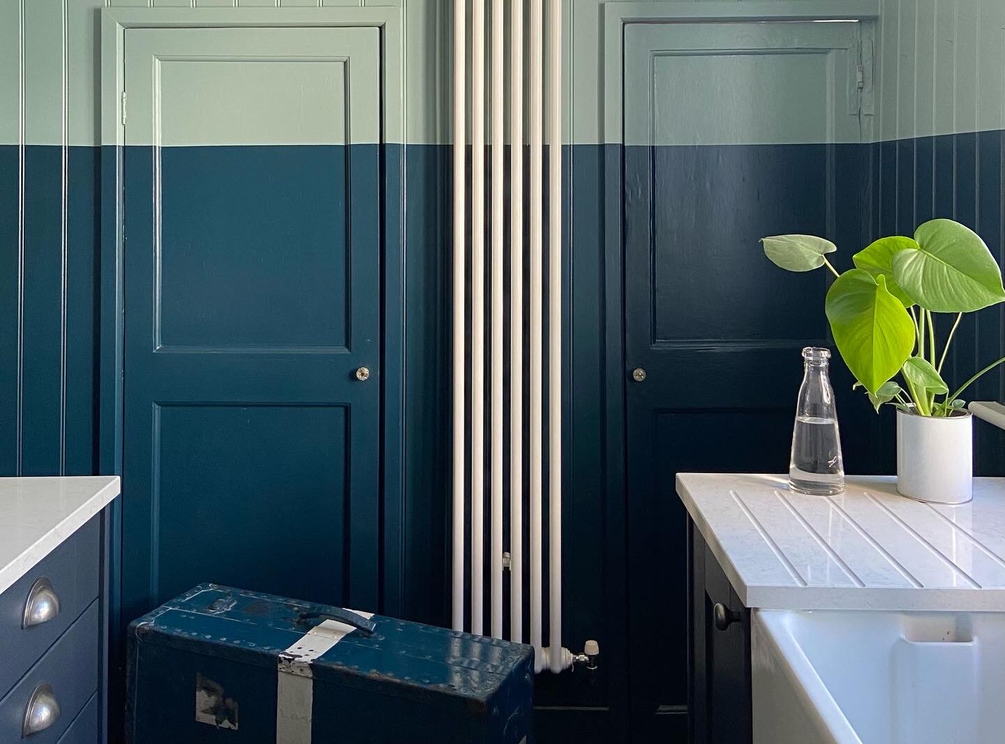 Above: Farrow & Ball’s Hague Blue meets Oval Room Blue on the back wall. The fridge and freezer are tucked under the quartz countertops.