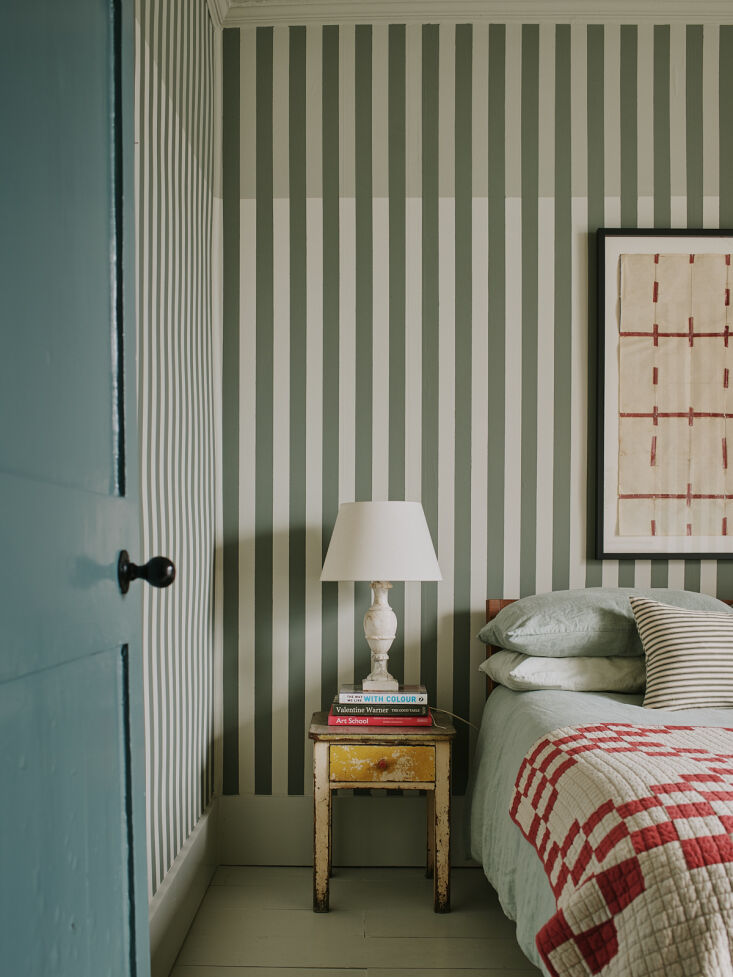 Above: Russell hand striped his bedroom, too: “it might look crazy but stripes are actually hypnotic and calming,” he says.