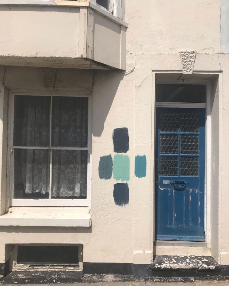 Above: The four-story structure is on a block of historic fisherman’s houses that ends at the ocean. Shown here, Russell’s shades of blue color tests. What sold him on Deal are the “swatches of pastel-colored Georgian streets”—and the fact that it’s a” long, thin stretch of a town, so no matter where you are, you’re on the beach in minutes.”
