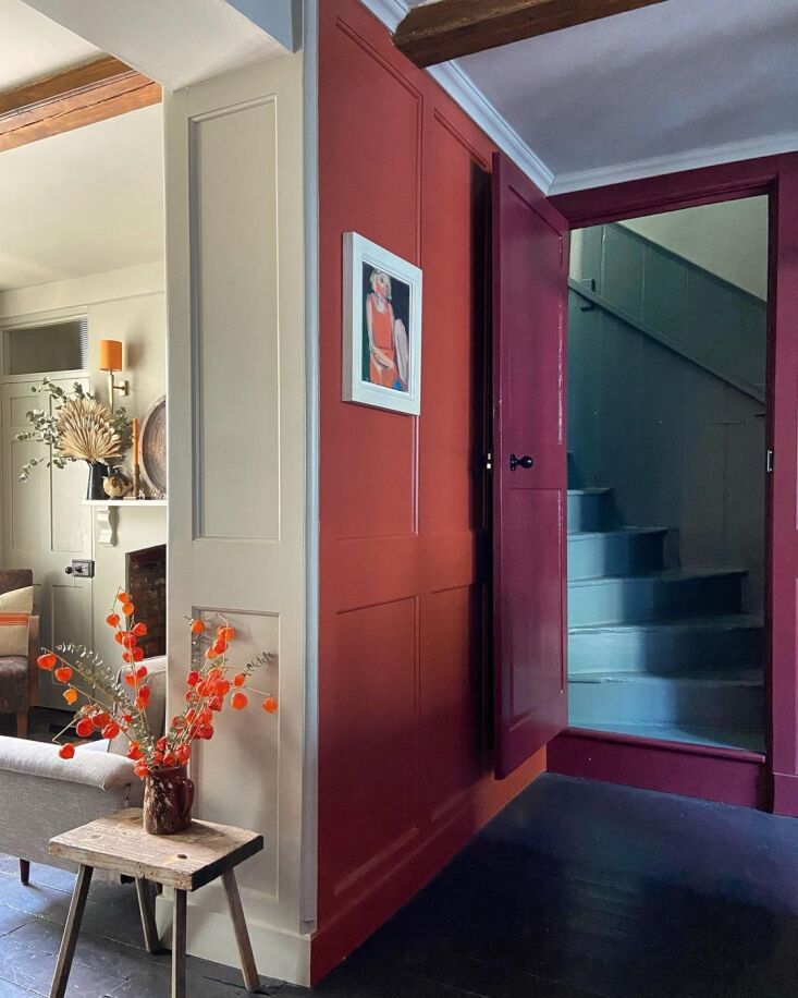 Above: A glazed partition opens the kitchen to the living area and provides a perfect cocktail bar ledge—it was a 1960s addition that Russell decided to keep though it required rebuilding. The ruddy shade used on the paneling is Farrow & Ball’s Picture Gallery Red.,