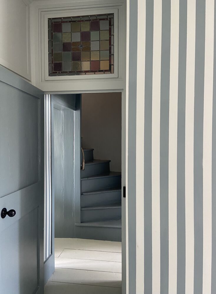 Above: After painting stripes in the downstairs hall, he kept going upstairs. The blue is Farrow & Ball’s De Nimes.