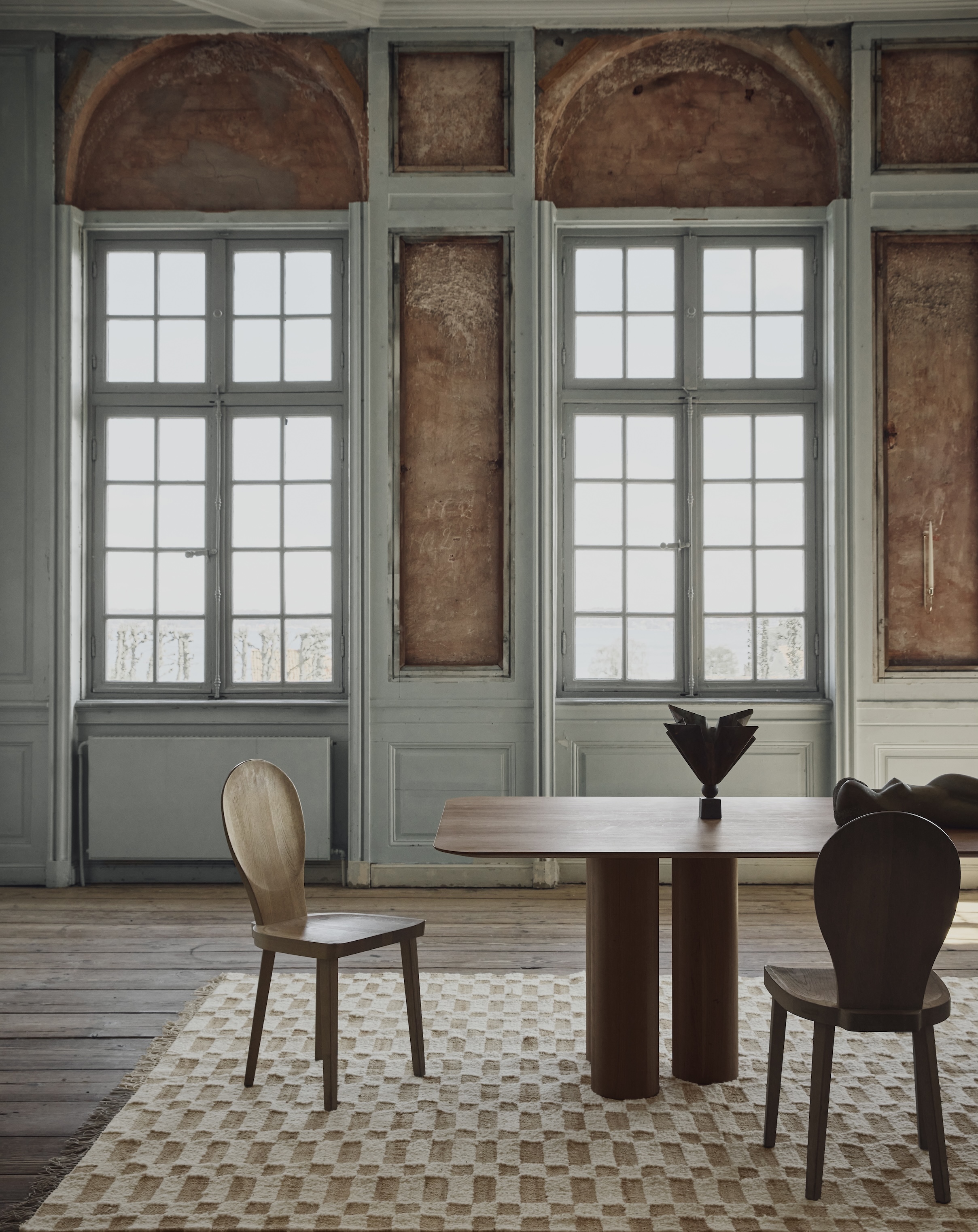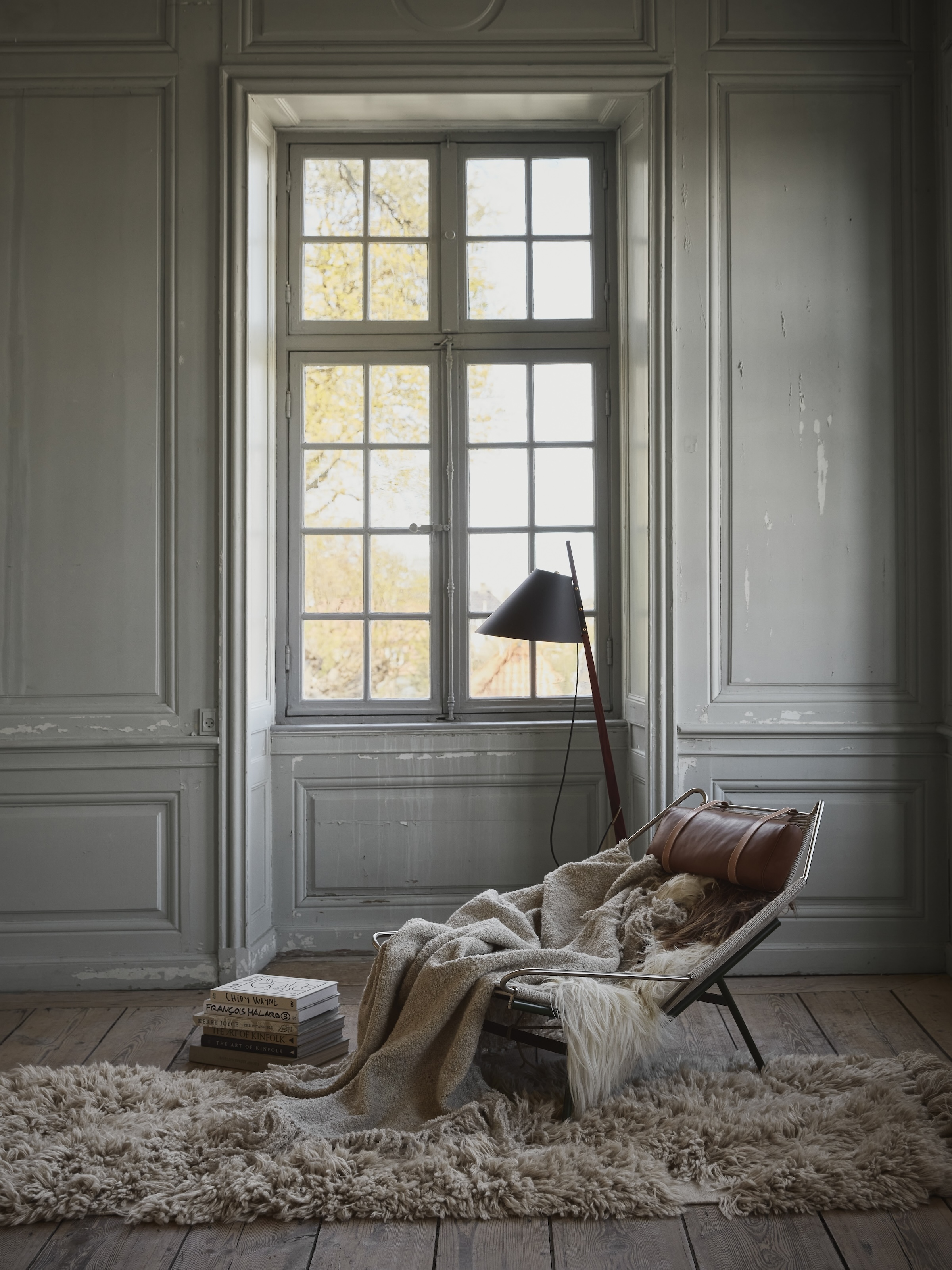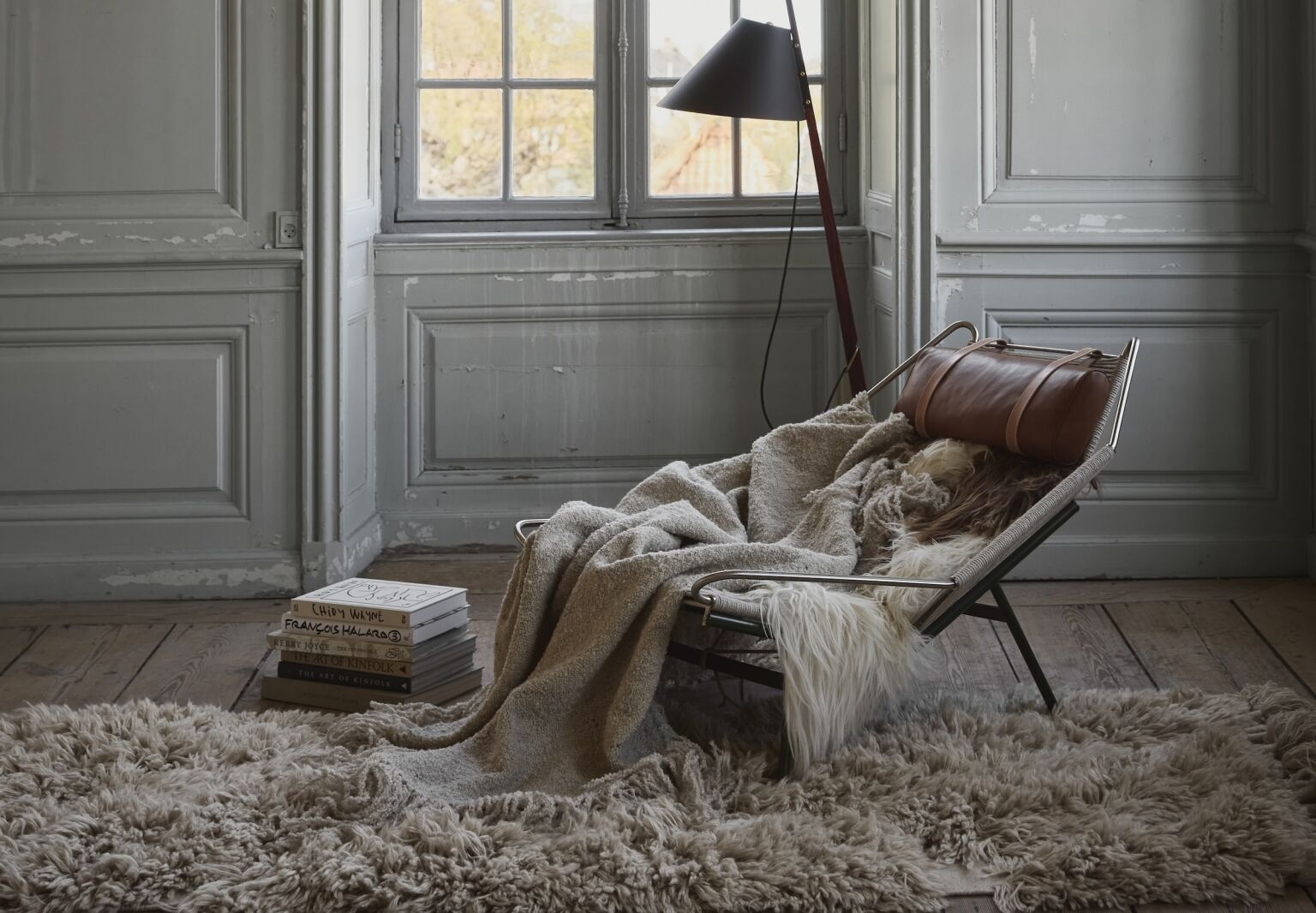 Above: Cappelen Dimyr’s has just introduced a new collection in handwoven jute and wool: this is rug no. 23 in a pattern of short and long checked boxes at Marienlyst Castle. “The mix of jute and slub yarn creates a three-dimensional look and feel,” note the designers. It comes in two sizes starting at 7.5-by-9.2 feet; $2,214. Styling by Artilleriet.