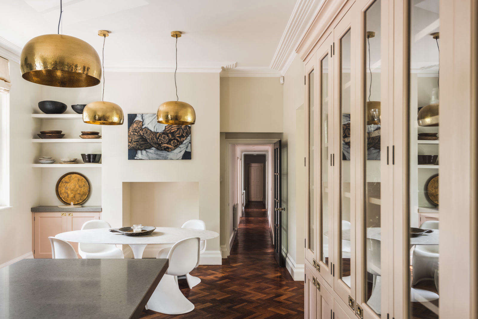 One of our favorite renovation projects is the conversion of Georgian estate in Cambridgeshire from a monastic silent retreat location to a glamorous modern home. The kitchen is one of the newer components of the renovation, situated in the place of the religious order’s canteen area. Complete with warm pink cabinets, brass fixtures, and mirrors galore, the result is anything but ascetic. Here’s a look at the main sources to get a similar look at home: