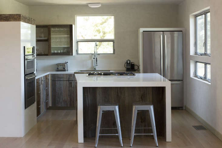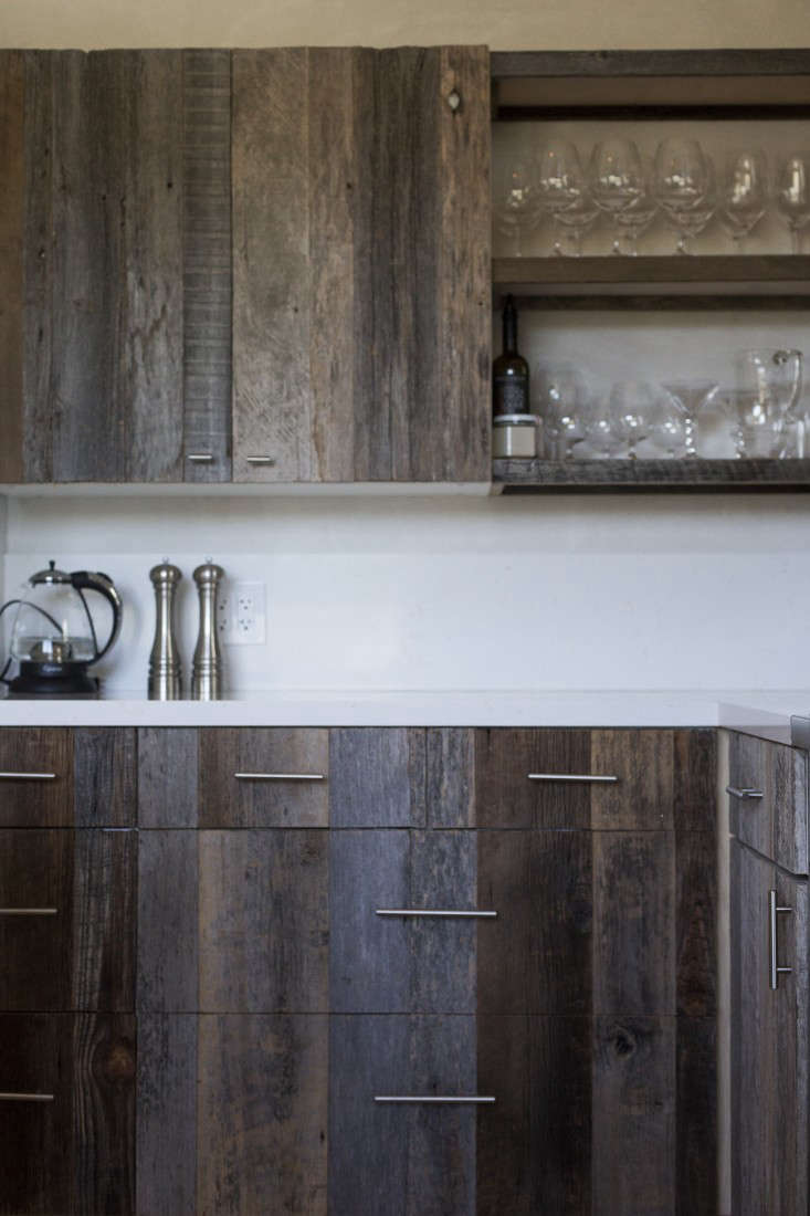 The Bures had worked with the designers on the redesign of a modest ranch house and so their likes (a clean look) and dislikes (pricey appliances) were well understood. The kitchen was the tricky part. Roché explains “We knew we wanted the kitchen to be connected to the main living space, and the living space to be connected to the vineyard view.” The challenge was how to match the kitchen to the reclaimed barn siding used to clad several walls in the living room. The solution? Ikea cabinets refaced with barn wood. Here’s how they did it.