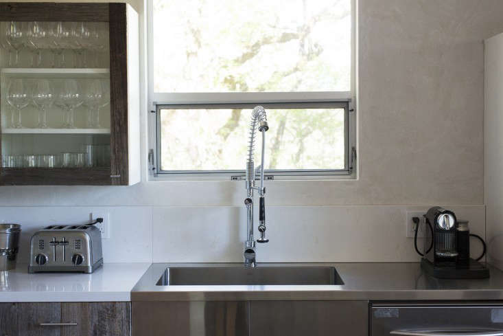 Above: The stainless counter is custom-made and fitted with an undermount sink. The swivel-spout faucet is the Kraus Commercial Pre-Rinse Chrome Faucet sourced from Overstock.com for $299.95. “We played a lot of digital tennis on this project,” says Roché. “I would email something fancy and Val would come back with something similar and cheaper from Overstock.” When Roché suggested the Tara Dornbracht, Van countered with the Kraus.
