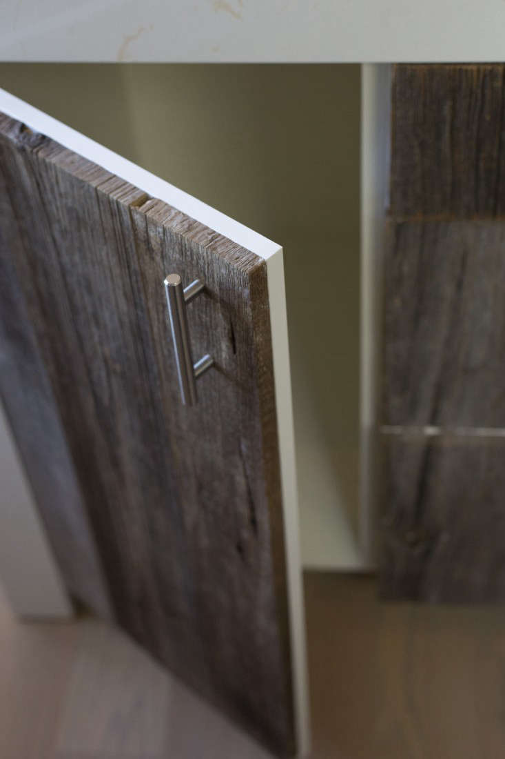 Above: Cabinet details: all of the vertical ends are finished with a 45 degree miter to continue the grain. Roché tells us, “It really makes a difference–instead of fresh-cut raw wood, you see a weathered edge that has a seamless look”.