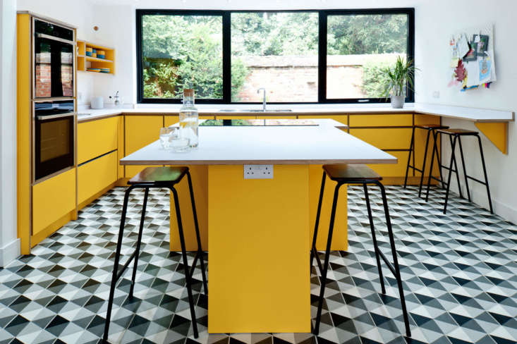 Above: Bright Formica and birch plywood meet geometric tile in a South London design by Koivu, a husband-and-wife-run kitchen company based in Kent, England.