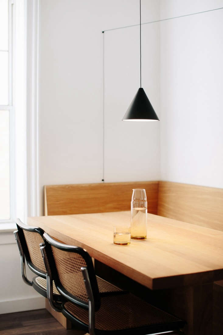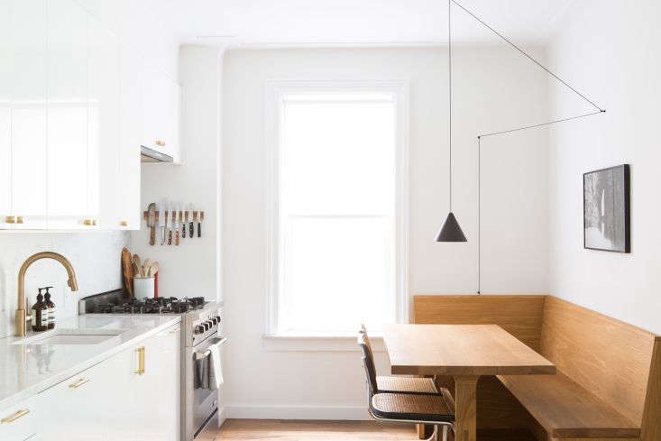 Above: Hanging above the dining table is Michael Anastassiades’s String Light for Flos, which Greenberg says is “designed to encourage the owner to create a linear design with the cord.” The dining chairs are vintage Cesca chairs by Marcel Breuer. Designing a kitchen? Start with our Remodeling 101: Kitchens guide, where you’ll find help with Kitchen Design, Kitchen Cabinets & Hardware, and Kitchen Storage & Organization. Then browse more favorite kitchens in: