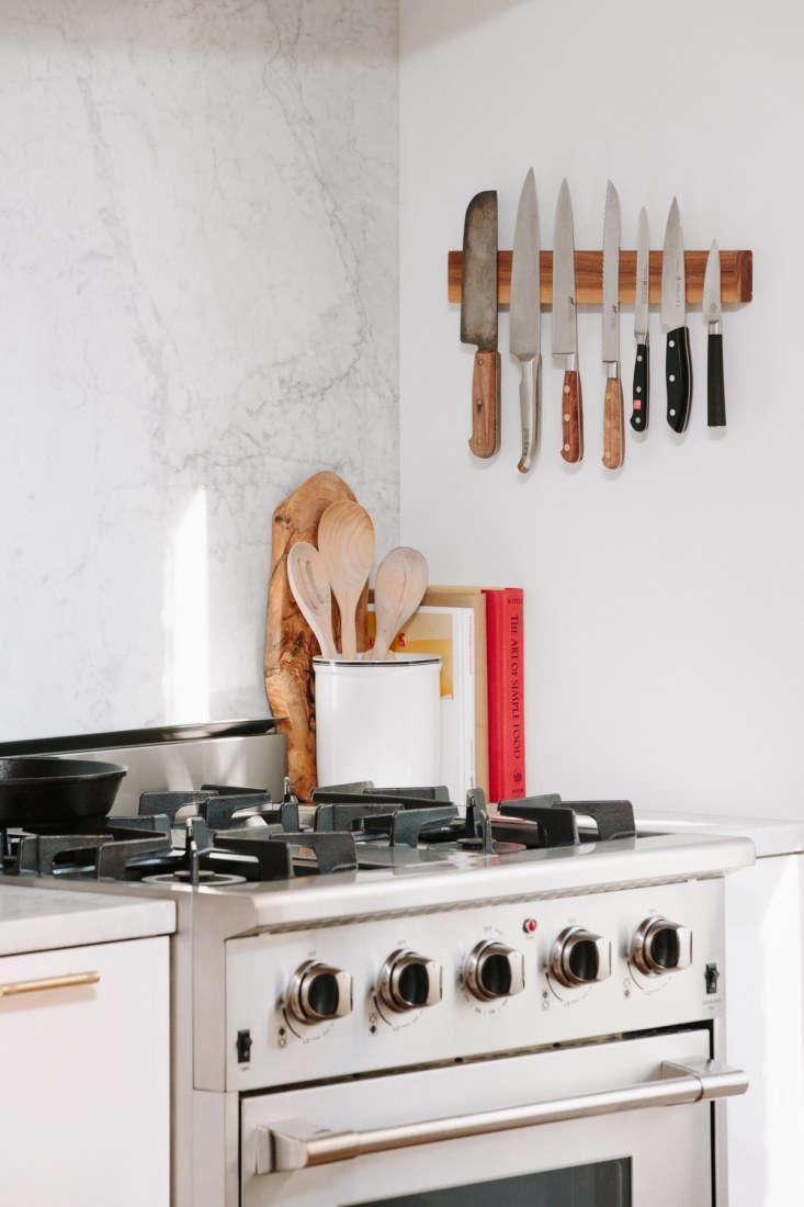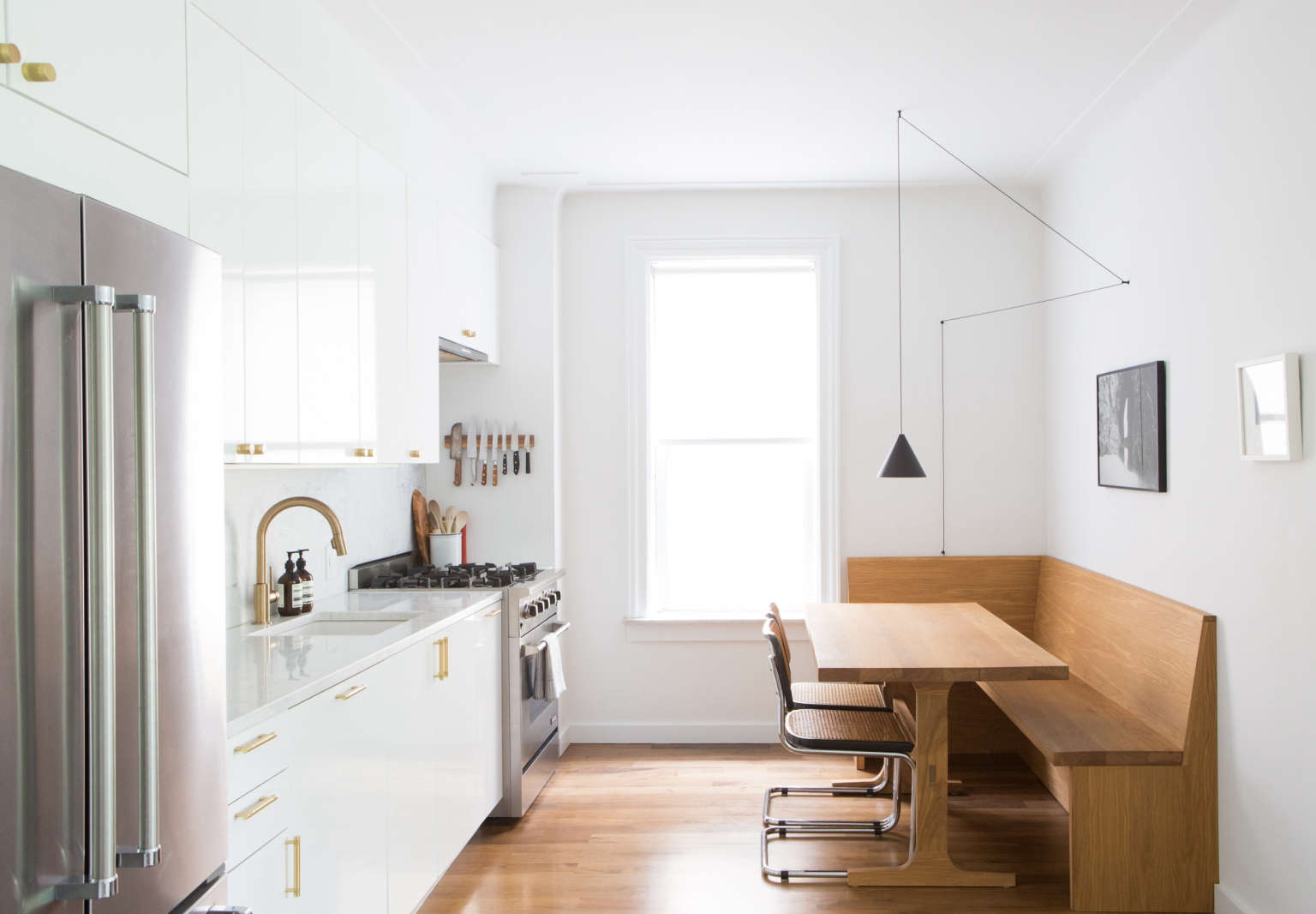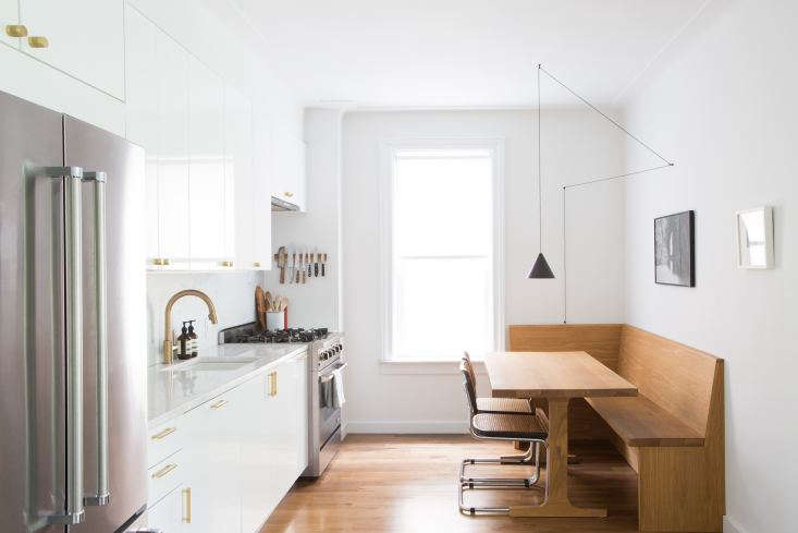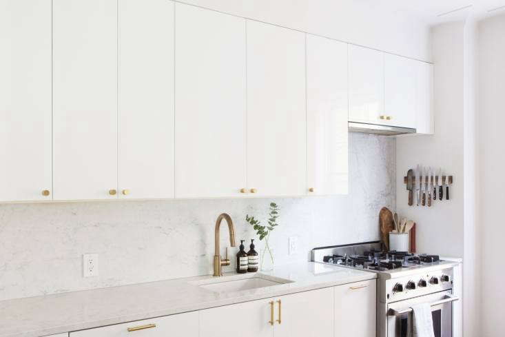 Connecting the cabinets to the wall serves a few purposes: It gives the cabinetry “more of a custom, built-in look, rather than feeling like boxes stuck on a wall,” Greenberg says. It also eases the transition between the new cabinetry and the apartment’s original, subtle, plaster ceiling crown. (“I tend to dislike the relationship between molding and the upper cabinets in kitchens that leave space above the cabinetry.”)