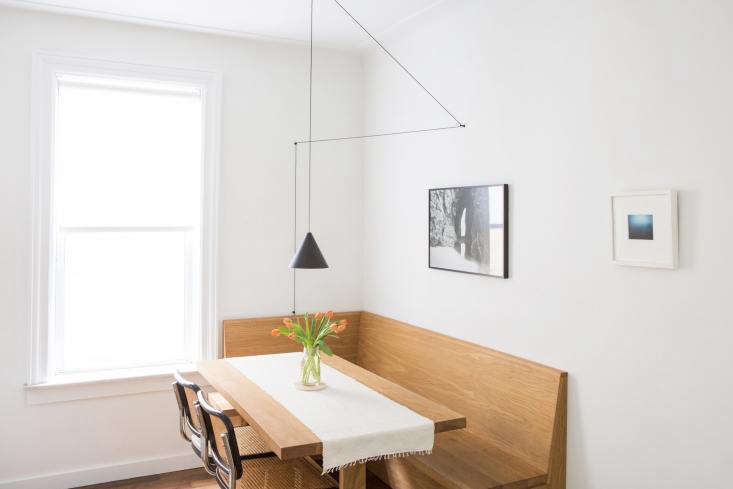 Above: The homeowners wanted a built-in banquette, so Space Exploration designed a custom L-shaped bench of oil-finished white oak with matching trestle table, installed in a corner of the kitchen. The wall just beyond opens onto the living room.,