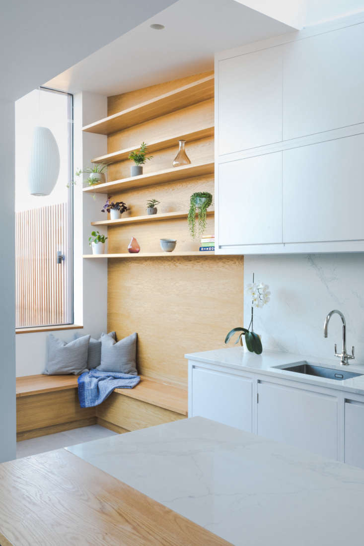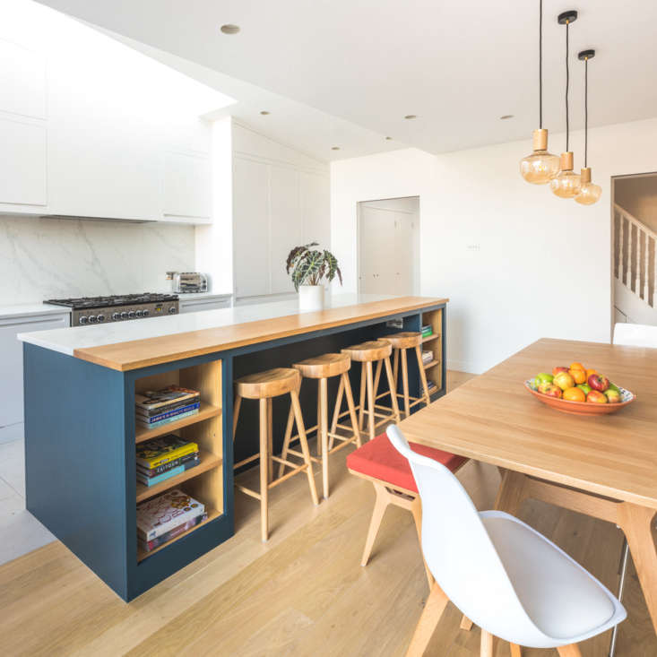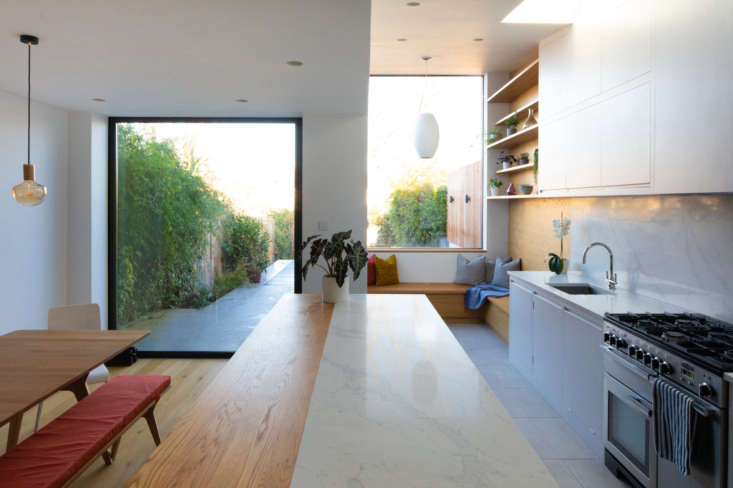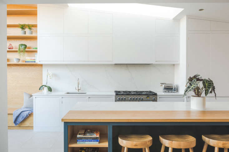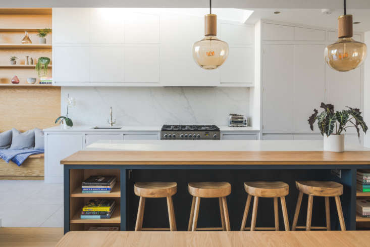 Above: The arresting two-material palette extends to the kitchen island, where the countertop is part Bianco Beleno, a quartz material, and part solid oak.