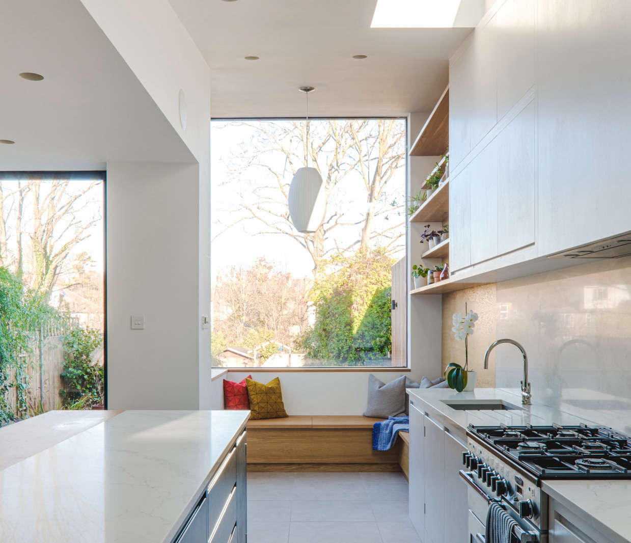 Above: The extension is light-filled thanks to a skylight, an oversized window, and a large glass pivot door that leads to the patio.