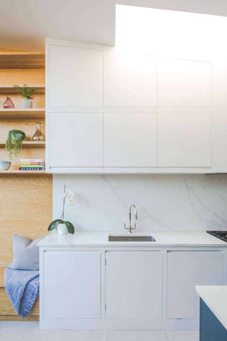 Above: The cabinets are painted Farrow & Ball Wevet; the island, Farrow & Ball Hague Blue. The left two tall cabinets comprise the double pantry; on the right is the integrated refrigerator and freezer.