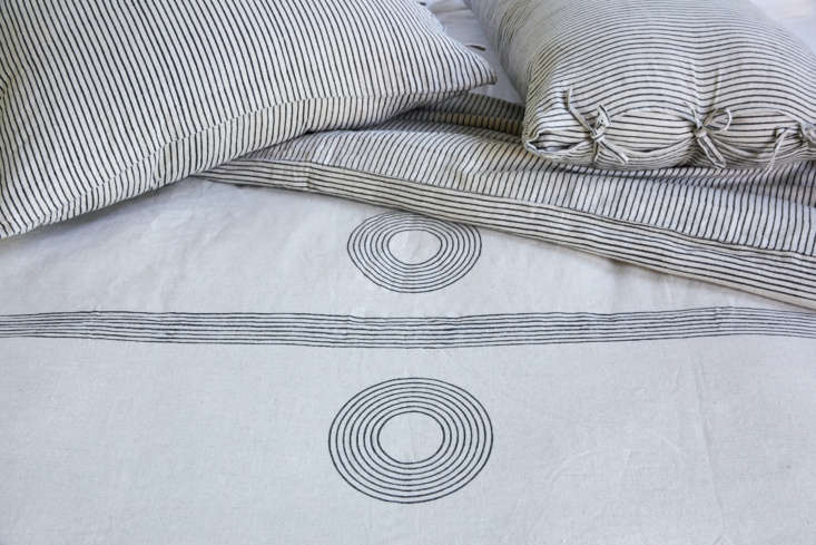 Above: The bedding collection is all 100 percent Irish linen that’s batch dyed and block printed by hand—and is machine washable. Shown here, the Magnet Duvet Cover and Pinstripe Shams in flax.
