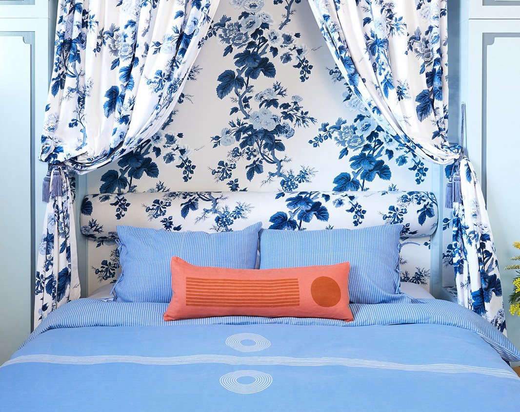 Above: The Magnet Duvet Cover and Pinstripe Shams in cornflower blue with the Horizon Pillow in coral.