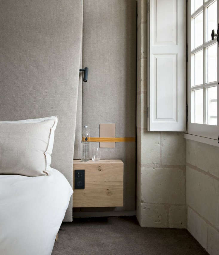 Above: In this restful bedroom at Fontevraud Abbey, a Loire Valley landmark newly converted into a hotel, the bedside table is equipped with an outlet–but Lewis advises placing your phone and charger elsewhere at bedtime.