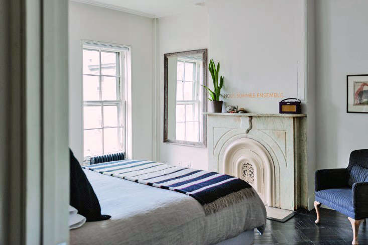 Above: A mirror can visually enlarge a small room, but it also can have a depleting effect when positioned near a bed. In architect Elizabeth Roberts‘ Brooklyn bedroom, shown here, Lewis would recommend draping fabric over the mirror next to the mantel during sleeping hours. Go to House Call to see more.