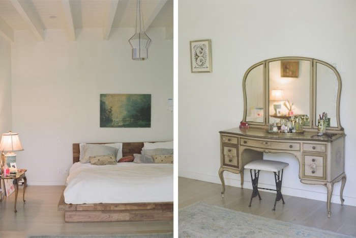 Above L and R: Shiva Rose‘s bedroom in the Santa Monica Mountains received the Lewis treatment, which included introducing a soft palette, shifting the antique vanity so the mirror is directed away from the bed, and using a rose-colored base sheet “to bring in passion.” Photograph by Ulrica Wihlborg via Sweden with Love.