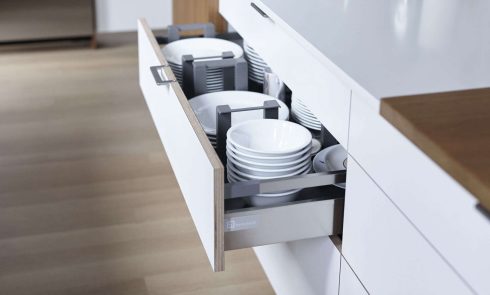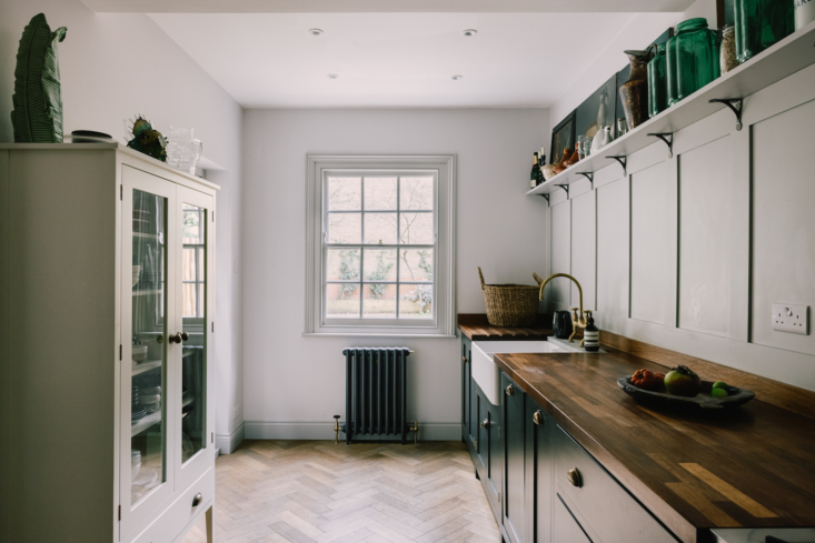Above: An iroko wood countertop adds warmth. The walls are covered in Paint & Paper Library’s Cotton I; the panelling and woodwork in Cotton IV.