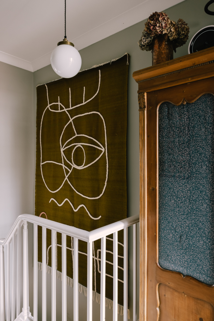 Above: A flat-weave rug featuring an abstract design becomes wall art on the second-floor landing.