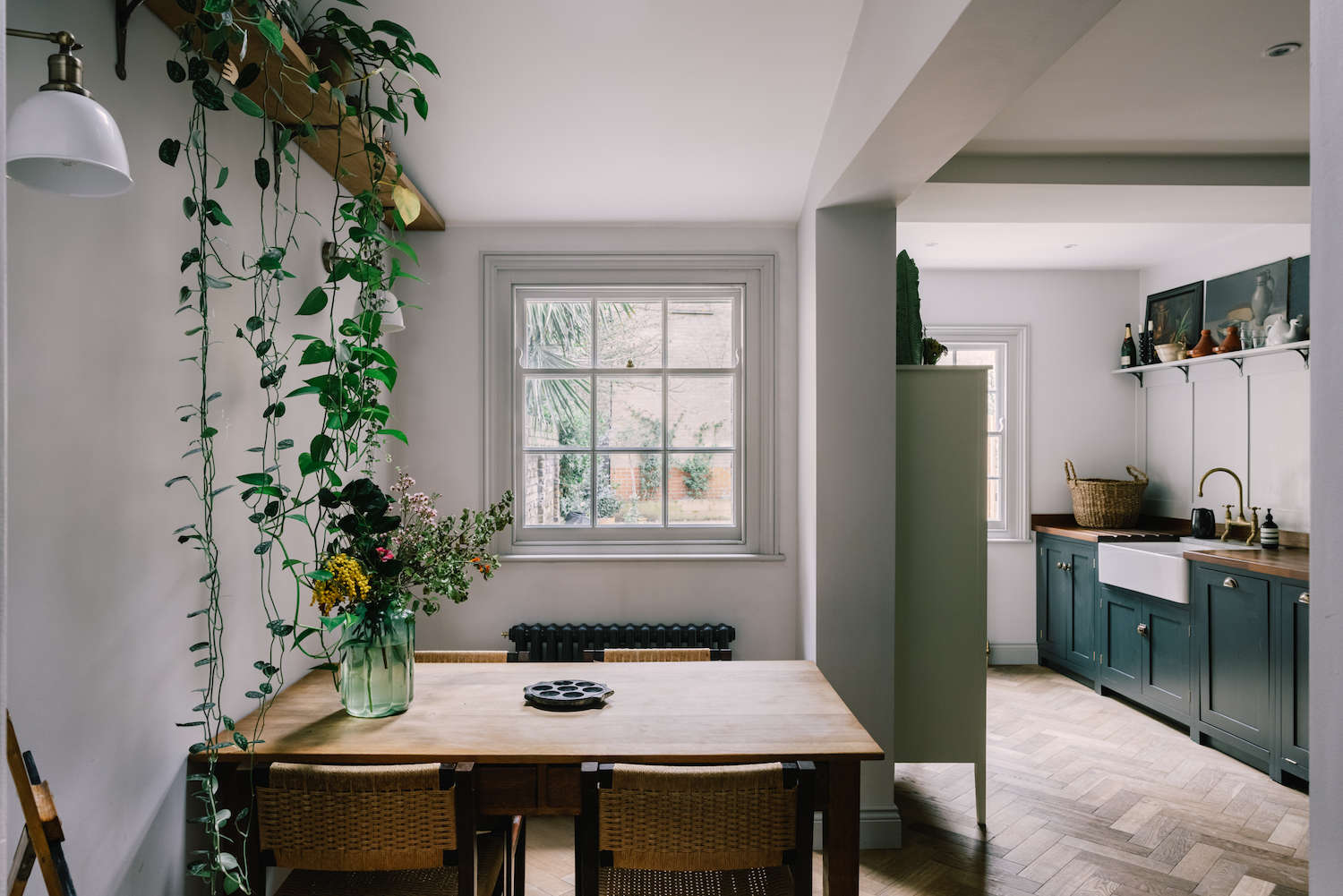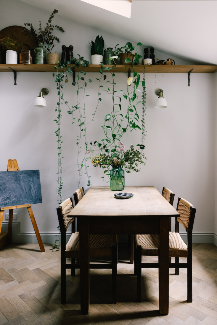 Above: Houseplants trailing down from a high wall-mounted shelf add a whimsical touch. The brackets on the shelf are from Ironmongery World.,