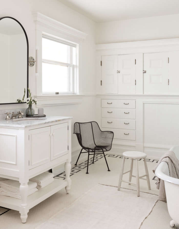 To unify the elements and draw the eye to the cabinetry, they painted all the surfaces Benjamin Moore Cloud White. The wire mesh chair is a vintage Russell Woodard Sculptura Occasional Chair, currently being reproduced by Woodard and DWR.