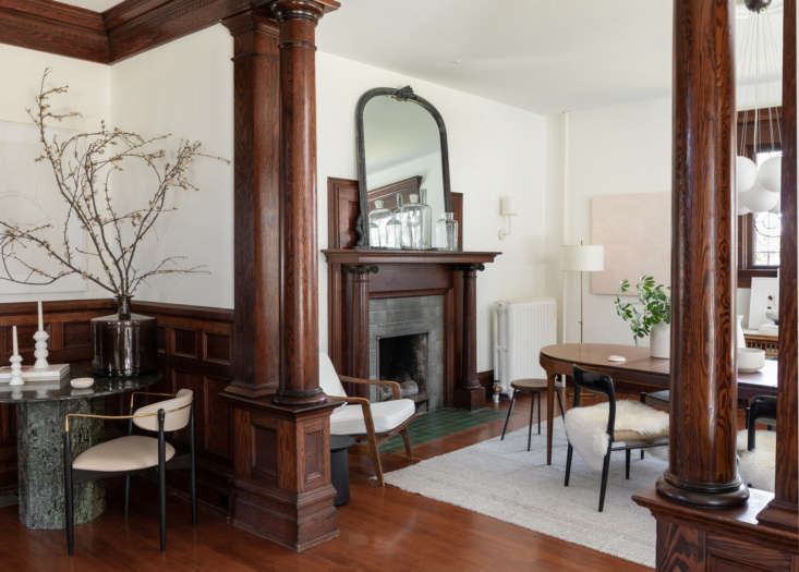 Above: The entry opens to the dining room, which has another of the house’s four fireplaces (and was likely originally the sitting room). The pink painting was commissioned by Hillary as a tribute to her late grandmother, the owner of an interiors store, who got her started on this path—and whole-heartedly encouraged the career shift.,