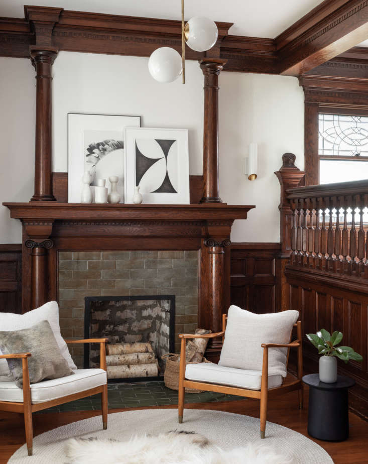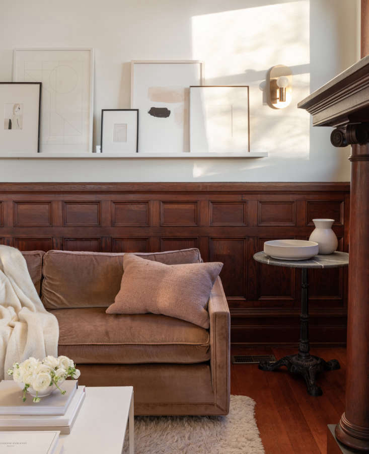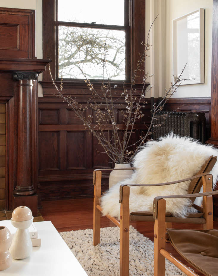 All of the wood detailing is local old-growth fir with its original mahogany stain. “I had my days of saying I just want to paint all of this, but I knew I’d regret it,” says Hillary. “The main floor is so architecturally busy that we tried to stay neutral with the furnishings and art, and to introduce texture to soften the spaces.”