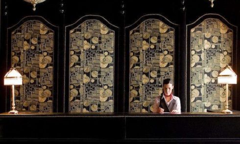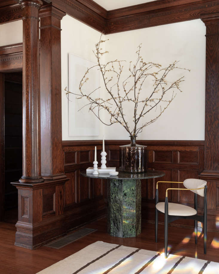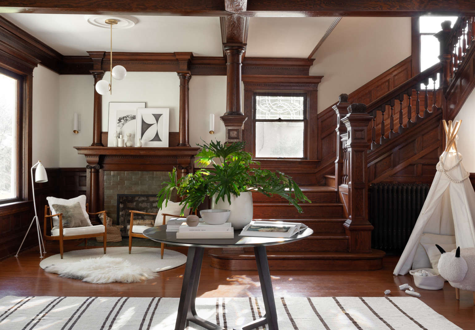 Above: “With all of its dark and deep details, the house was a hard puzzle to solve,” says Staton. “We wanted to quiet it down a bit, and to immediately telegraph that it’s a family home.” Towards that end, they pitched a tepee in front of the grand stair. And they selected a few clean-lined, 20th-century classics, such as this green marble table from Homestead Antiques in Seattle and 1960s Ib Kofod-Larsen chair, to add what Staton calls “a layer of modernity.”