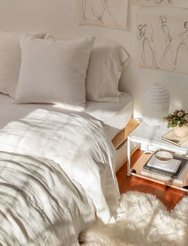 The master bedroom has a balcony that overlooks Bellingham Bay: “We can see the downtown marina and San Juan Islands,” says Hillary. The bedside Hood Sconces are by Brendan Ravenhill, and the Simple Linen Bedding is from Hawkins New York. Hillary ordered the Linen Curtains from H&M online: $99 for two panels, hemming tape included.