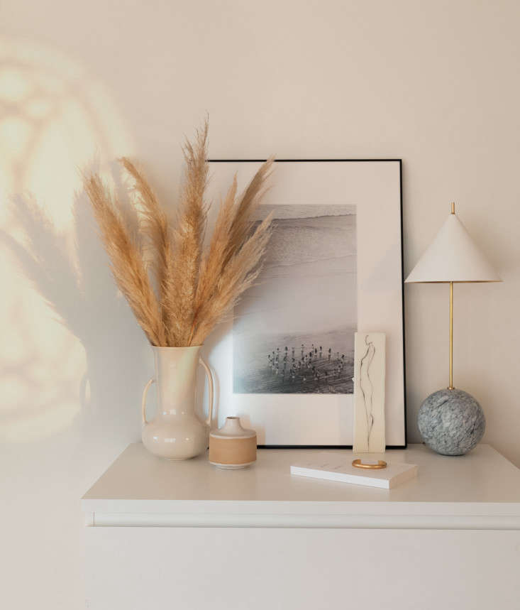 Above: A still-life on an Ikea dresser. The  light is the Cleo Orb Base Table Lamp by Kelly Wearstler for Circa Lighting. Hillary’s mother gave her the black and white photo on the day of the 2017 Women’s March—it shows naked women forming a peace sign.