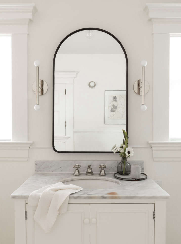 Above L:Hillary and Lisa introduced the large mirror from Rejuvenation and Triple Seven Home sconces—”it’s a narrow space and a nice thing about these lights is that they don’t take up much room but they have scale.” says Hillary. The nickel New York Cross Handle Faucets are $259 from Signature Hardware. Above R: The tub is original.