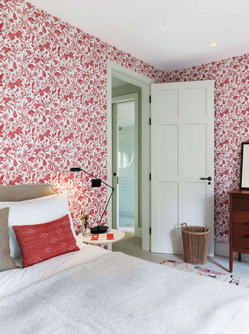 Above: “The master bedroom is where we broke away from the subdued hues,” says Mellersh of the Marthe Armitage Hop Garden wallpaper in a “dusty pinkish red that lends a somewhat vintage backdrop to the furnishings.”