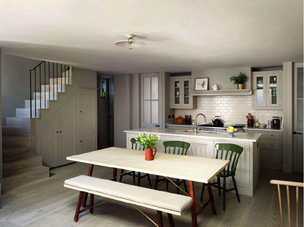Above: Relocating the formerly central stair allowed for an expanded kitchen/family room (452 square feet total) on the lower level. The cabinetry is Plain English’s Spitalfields design (stay tuned for more on the UK kitchen company tomorrow). The contrasting ash and walnut table and bench are the Dining Table Two by Another Country. The green Windsor chairs are from Howe: See more in 10 Easy Pieces: The Windsor Chair Revisited.