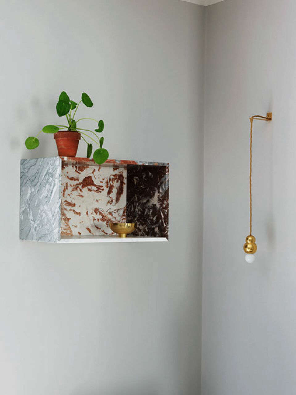Above: Quiet luxuries: A Marble Bookcase by Muller Van Severen from The Apartment holds an Ilse Crawford for Georg Jensen brass bowl. The Ball Light is one of Anastassiades’s signature pieces.