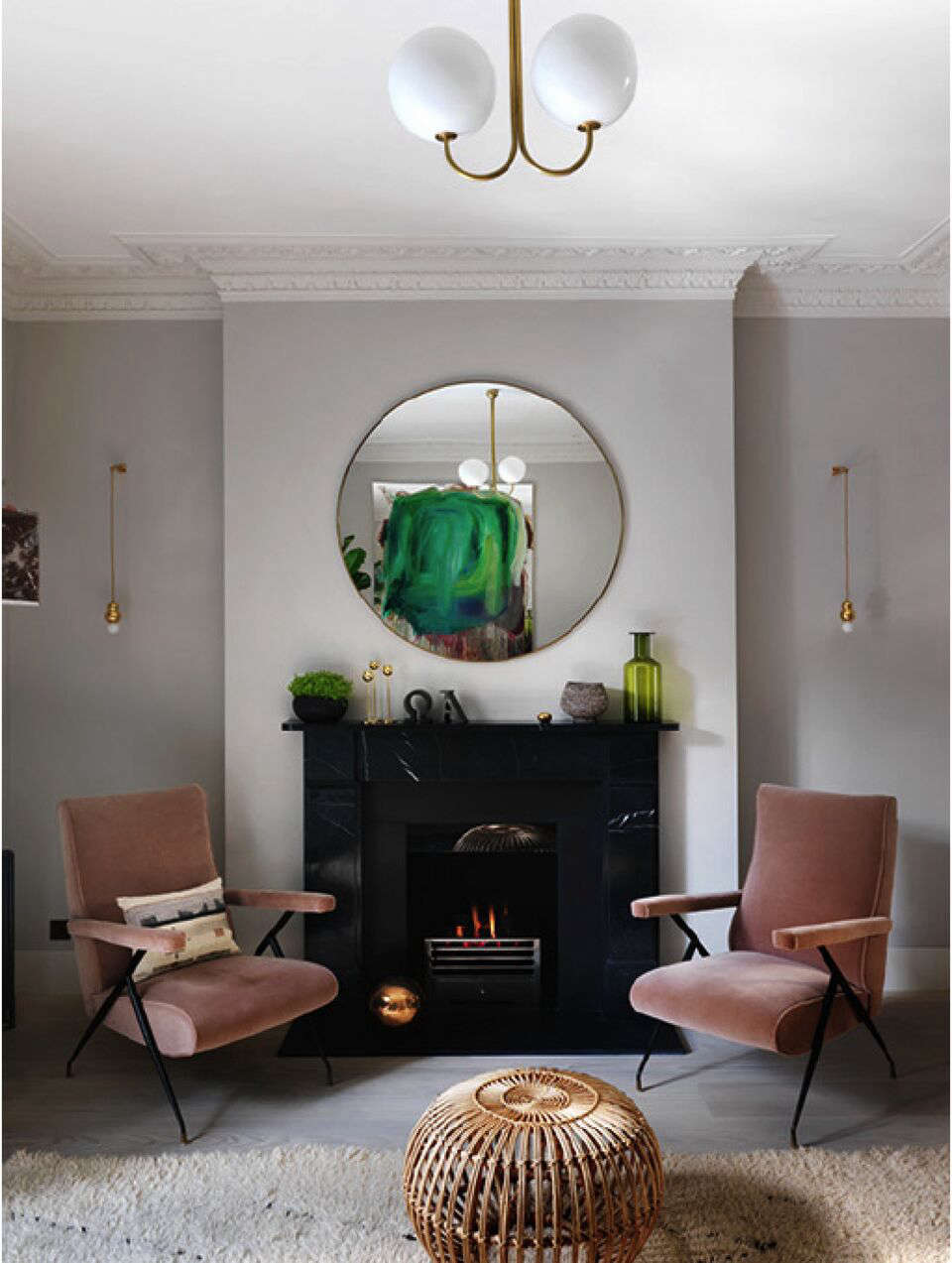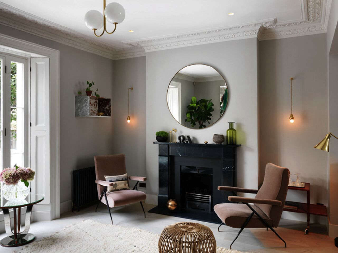 Above: On the ground floor, Mellersh designed “a modern take on the traditional parlor,” fitted it with a black marble mantel by Chesneys.