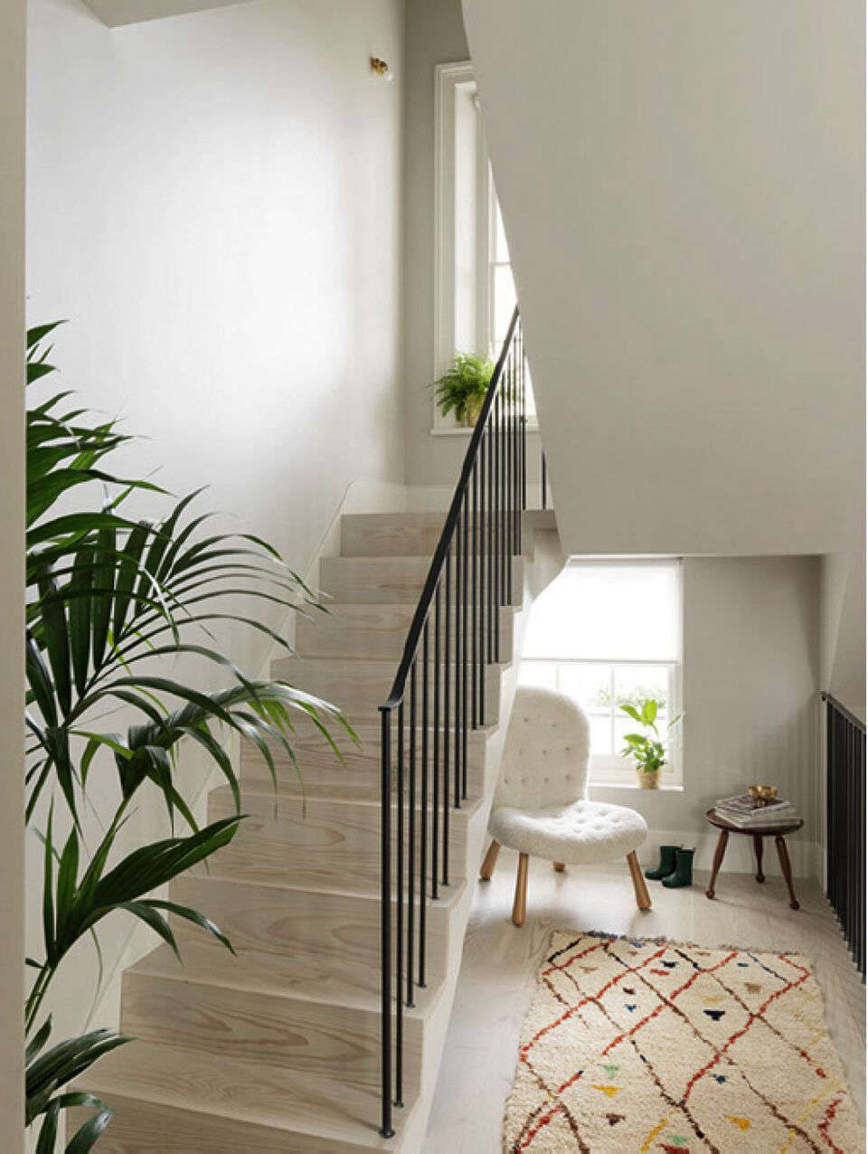 Above: The bleached Douglas fir flooring from Dinesen continues on the stairs. The gray walls and tall sash window, Mellersh notes, are “reminiscent of a scene from a Vilhelm Hammershoi painting.”