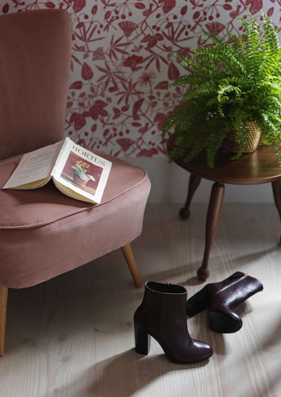 Above: A vintage cocktail chair in rose velvet from Emery et Cie. The Walnut Stool is a reissued Josef Frank 1950s design from Svenskt Tenn.