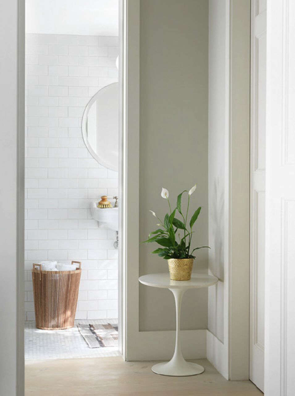 Above: A Josef Frank brass Hortus Planter stands on a vintage Saarinen table outside the master bath. The towel basket is a Piet Hein Eek design made in Vietnam from scrap wood.