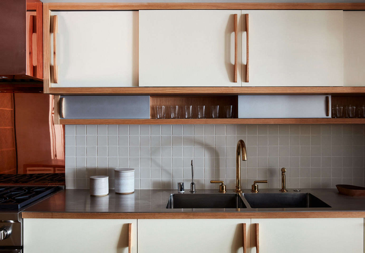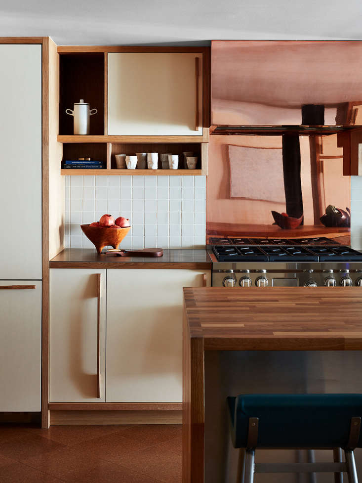 Above: “The handles are inspired by Charlotte Perriand’s. We did our own version of her vertical cabinet pulls,” shares Alonso. A mix of metals— stainless steel on the countertops and along the side of the island; a copper backsplash and vent hood, unsealed to allow for oxidation—plays nicely.,