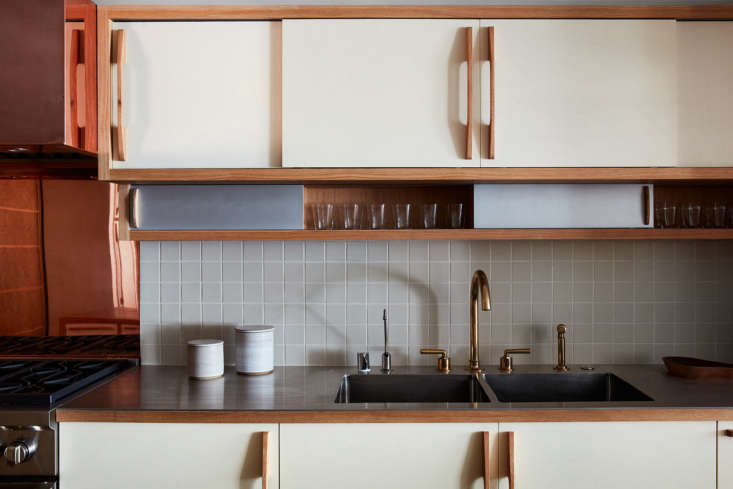 Above: More metals to add to the appealing mix: aluminum sliding doors (fronting the slim niche for drinking glasses) and a brass faucet from Waterworks’ “Henry” line. “The tiles are Heath ‘Nude’ tiles that we developed for the Tartine Manufactory project in San Francisco and later became part of the line at Heath. It’s the clay used for the tiles [but] with no glaze and simply sealed, hence ‘nude’,” explains Alonso.