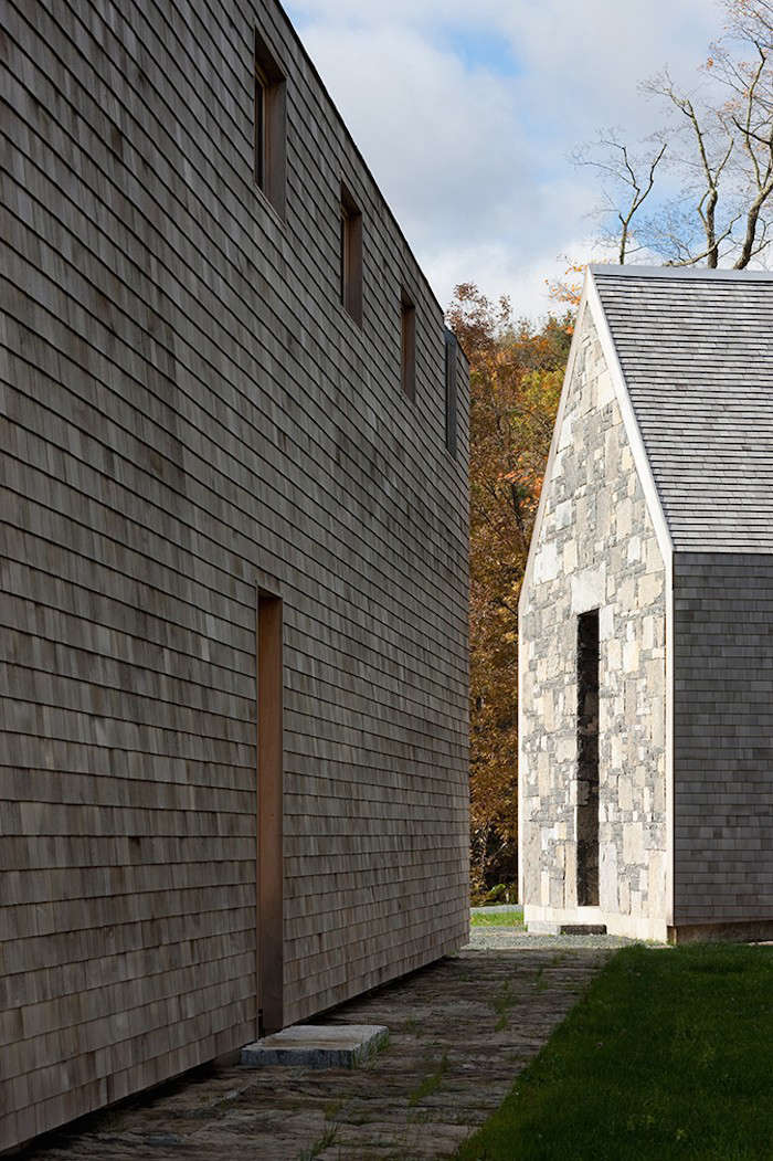 For this project in the Green Mountains of Vermont, set on a 210-acre parcel, Joy departed from his usual vocabulary and created a gable-roofed, steel-framed cedar-shingle-and-stone house and barn. The traditional “stone-ender walls” are made from bedrock salvaged from the bottom of Lake Champlain, engineered by Olde World Masonry. Among the green features Joy incorporated in the design are a wind tower, solar panels, geothermal heating, and a hydropower feature, all of which means the clients will be “selling electricity back to the power company very soon,” Joy says.