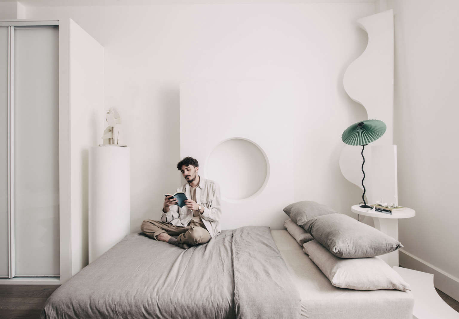 We ourselves found Piccolo via The Modern House, which spotlighted his stylishly patched-together studio apartment, a rental in South East, London, filled with prototypes, works in progress, and a lot of uplifting curving lines. Piccolo, who grew up in a peripatetic Italian family (and has recently himself moved to a new flat), says he learned from his artist/interior designer mother that “the idea of home is less about a physical place and more about the objects we live with that carry significance and meaning.” He recently gave us a guided tour via Facetime.