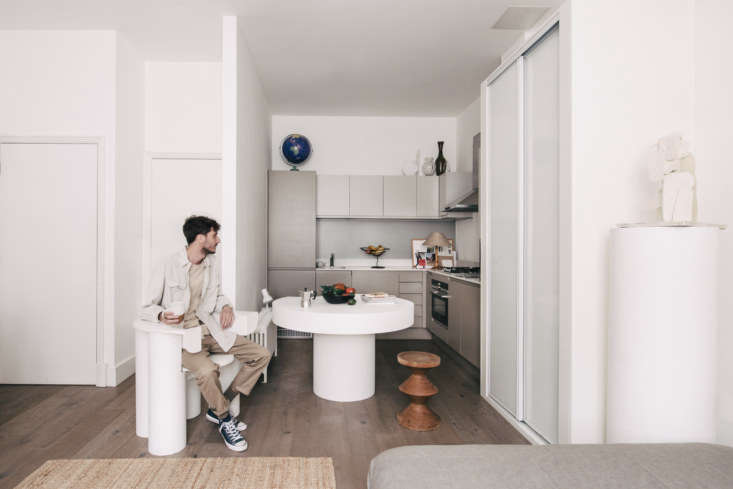 Above: The apartment came with a streamlined kitchen: the fridge is under the globe, a cupboard and bath are located to the left, and that’s the closet behind the double doors. The round table is a prototype for a forthcoming Dello Studio piece and the “Buffalo Mozzarella Chair” is by his friend Elliott J. Barnes.