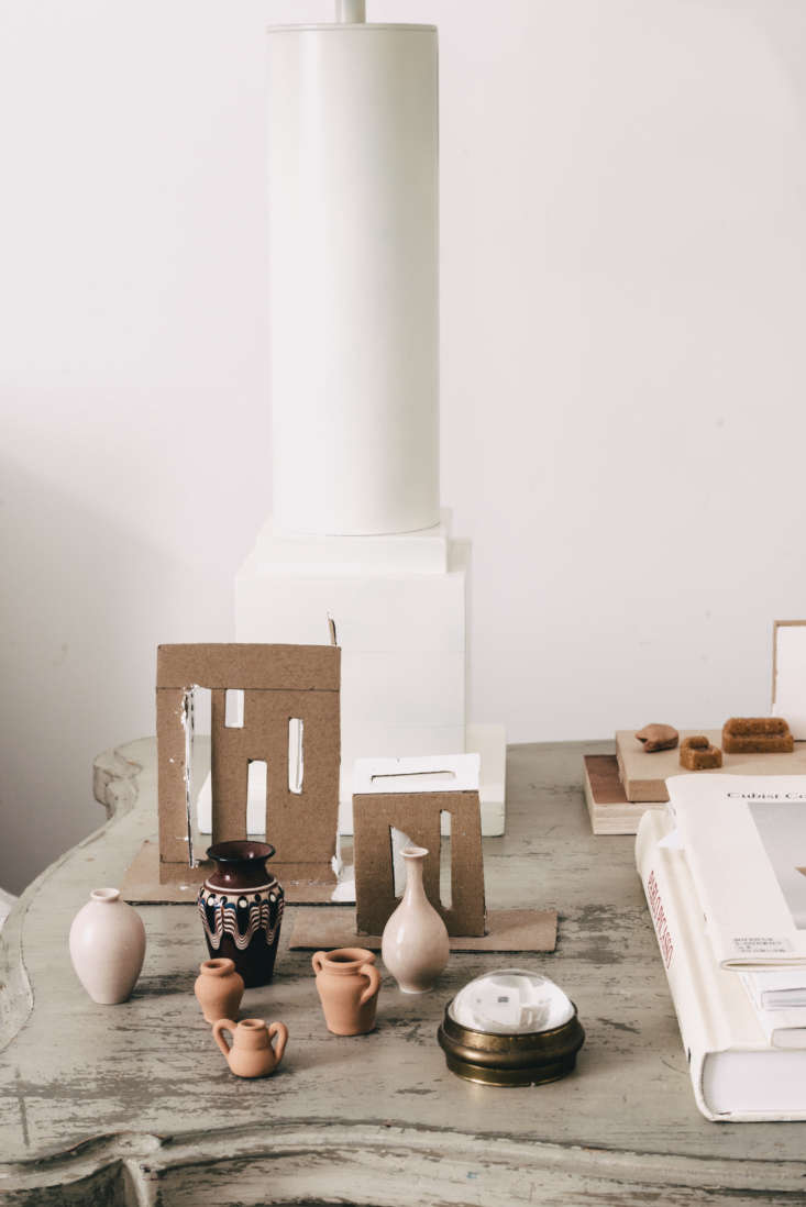 Above: A flea market side table holds Piccolo’s miniature vase collection: “they’re all gifts from friends—they know I’m obsessed with vases.” The cardboard forms are maquettes for design projects.