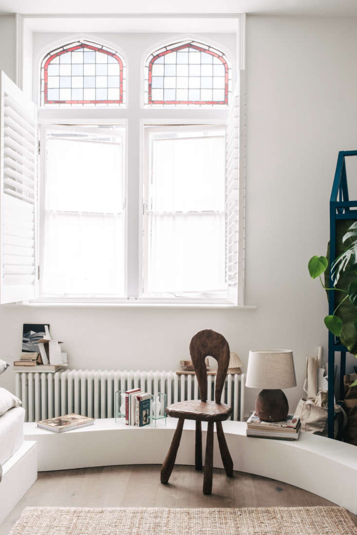 Above: The one-room apartment is in an 18th-century building—located in an area called Shooter’s Hill, it was originally a military academy—with tall ceilings, stained glass clerestory windows, and interior shutters. The carved pine 1940’s French chair —”its reminds me of the Flintstones”—is a favorite of Piccolo’s on long-term loan from Beau-Traps, his friend Maxime Fisher’s online antiques business.